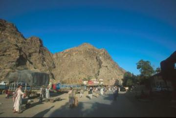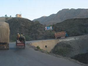 | カイバル峠。難民の帰還や救援物資を満載したトラックがひっきりなしに通る。 |