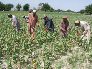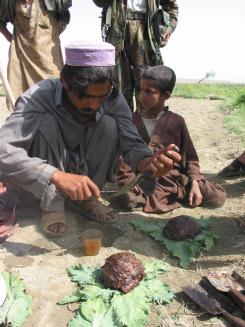 一時間ほどして急斜面を一気に上り詰めると、眼下の狭い谷間に一軒の土で出来た民家が目に飛び込んできた。 緑、白、黒の3色旗が敷地のはずれのポールにはためいたいた。旧政権の旗だ。なぜ新政権の旗と取り替えてないのだろう。 トヨタのトラックが3台みえた。近づくと若い兵士が止まれと現れた。 車からアマンとアガン村から乗り込んできた警備の若い兵隊が降りて、話しに民家の中に入っていった。 まもなくアマンが、車に向かって降りてこいと手招きをした。 車の外に出ると20平米ほどの畑にびっしりケシの花が咲いているのが目に飛び込んできた。 標高が高いためにジャララバードよりはかなり涼しい。 われわれは、家の中に通され、お茶と昼食の持てなしを受けた。ナン、豆のスープ、ジャガイモの鳥だしスープ、生タマネギだった。 質素だが、うまかった。 ここの兵士たちは今作戦に出かけていていない。留守中の責任者であるモハンマド・シェールさんは兵隊生活を20年以上続けている。 ソ連時代はナンガルハールで、アル・アザルガリというムジャヒディンリーダーの元で戦っていた。 ここではアフガン軍兵士20人の責任者。まるで農家の親父と言った感じの腹の出た、おじさんだ。 入り口の脇に6才ぐらいの男の子が老人と一緒にいた。 このちかくに米軍のヘレポートが建設されているという。何のために建設しているのかいっさい知らされていない。 しかし、チーフは知っている、と言う。ここには米軍とカナダ兵が700人駐屯し彼らと一緒に行動している。 入り口にはたくさんのレーション(戦闘食)の袋が落ちていた。 当初撮影は禁止と言っていたが、うち解けて来たので頃合いを見計らってインタビューの写真を撮らせてとお願いすると、OK。 側にいた兵隊たちも一緒にとってくれという。 外に出てケシ畑と山も一緒に撮りたいというと、これもOK。ほとんど撮らせてもらった。当初撮影は禁止だと言ったのは何だったのか。 帰り際に、日本で働いていたことがあるアマンは「米軍は何でも好き勝手にやっている。沖縄と同じだよ」と吐き捨てるように言った。 昼食後、1時間ほどで帰ることに。みな外に出て見送ってくれた。 上空から、OV-10偵察機の鈍い音がかすかに聞こえた。