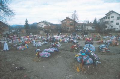 そのうち、仲間が次々と病気になって死んだ」と言って手術の傷跡を見せてくれた。 内戦の終結した1996年。この村のセルビア人はユーゴ国境に近い町ブラトナツに移住させられた。その数、3500人。 ブラトナツは現在人口2万2千人のセルビア人の町。 この町の診療所長ヨバノビッチさんは「年間延べ9万2千人の受診者があるなんておかしい」と最初に異常に気づいた一人だ。 独自調査に乗り出したエルリッチさんは死亡率に注目した。 「地元住民が6%。ハジッチ村からの移住者が11.7%と異様に高かった」という。 村のはずれの丘の上には墓地がある。内戦で亡くなった軍人の墓が並ぶ。その裏側にハジッチ出身者の墓がかたまってある。みな新しい墓ばかりだった。 死因はわからないが、今年亡くなった人はすでに10人、まだ一ヶ月しか経っていないのに。 ユーゴスラビア軍事医学アカデミーのスタンコビッチ法医学部長は 「空爆後5−6年の間にハジッチからの移住者の10%にあたる人が肺、膀胱、肝臓ガンなどで死亡した」と言っている。