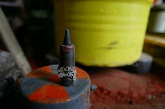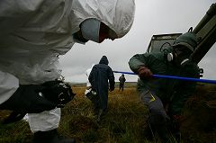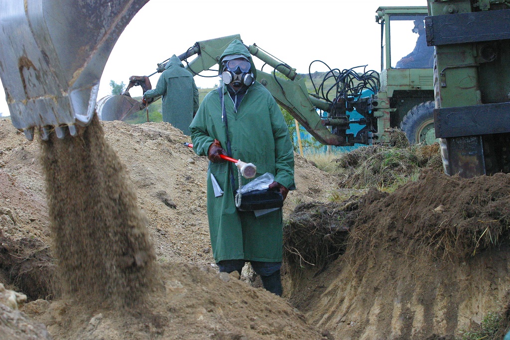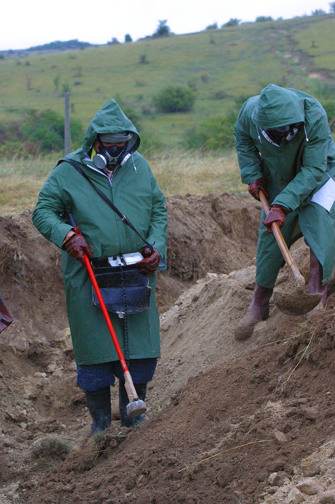 小雨の降りしきる中で3台の重機がひとすくいずつ土を掘り出し、鍬でならして放射線測定器を近づける。気の遠くなるような作業だ。「ここは機械が使えるからまだいい。急峻なところは機械が使えず手作業にならざるを得ない」と作業員はいう。これまで、700個近くの劣化ウラン弾を発見した(2005年9月現在)。「いまは、土壌や水の汚染はないが、近い将来は可能性がある」と案内をしてくれた、科学環境保全省の職員は言う。