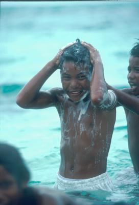 浜に乗り上げたボートから、降りると子ども達が、駆け寄ってきた。私は久しぶりの訪問客らしい。