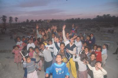 ここは湾岸戦争以後作られた新生児から10才までの子供専用の集団墓地だ。 埋葬されている子どもの数は正確には解らない。誰も墓地を管理しているものが いないからだ。数千とも数えきれない。昨夜乗ったタクシーの運転手が言ってい た「この国では子供がたくさん死んでゆく」という意味がはっきり分かった。若 夫婦が墓参りに来ていた。よく見ると小さな土饅頭の上にタイルの破片でできた 粗末な墓標が乗せられていた。墓は隙間なく掘られていた。先ほどから歩いてい たところが土饅頭の上だったのだと気づいたとき、思わず後ろを振り向き合掌し てしまった。 夕焼けに染まる墓地の脇の広場では子どもたちが裸足でサッカーに興じていた。 歓声を上げながらボールを追いかける子どたちがいつか、ここに眠ることになる かも知れない、貧しい子どもたちの運命を見てしまったようで悲しみがこみ上げ てきた。 私がカメラを提げて墓地から出てくると子どもたちに捕まってしまった。イラ クの子どもたちはカメラを見るとどこでも集まってきて、パニック状態になって しう。彼等を納得させるためにはシャッターを何度か押すしかない。先ほどのセ ンチメンタルな心は、押し寄せて来た元気な子どもたちによって一気に吹き飛ば されてしまった。この時にシャッターを押した一枚がこの写真である。現像があ がったフィルムをルーペで覗いた時、写真に写っている子どもたちと背後の子ど も専用墓地とのギャップにぎょっとしてしまった。