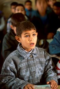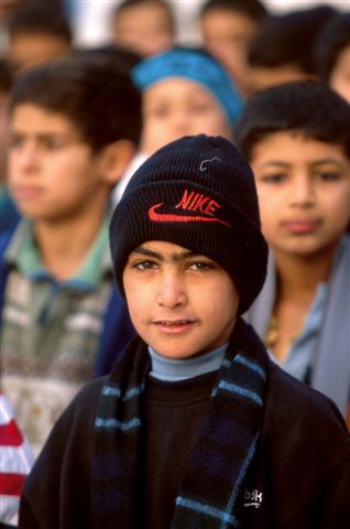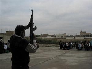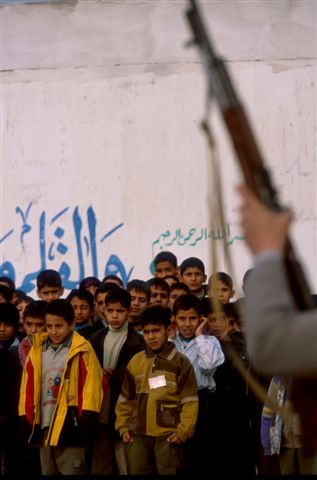 昨年11月頃から毎週木曜日の朝礼で子どもたちの銃声を聞かせ、 戦争になったときに驚かないように子どもたちの耳を慣らす訓練が始まった。 子どもたちの目の前で本物の銃を発射して、銃声を聞かせていた。 耳を押さえる子どももいた。(バグダッド)