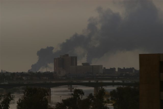 バグダッド市内を取り巻くように原油が燃える黒煙が市内を覆った。 イラク側はタンクローリーで原油を市の郊外に運び、広場に放出し火をつけた。(3月23日)