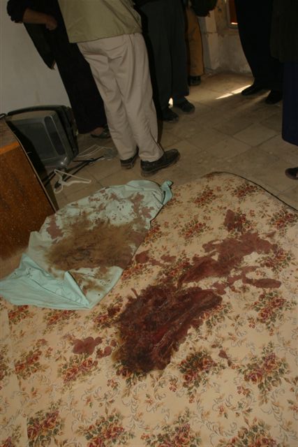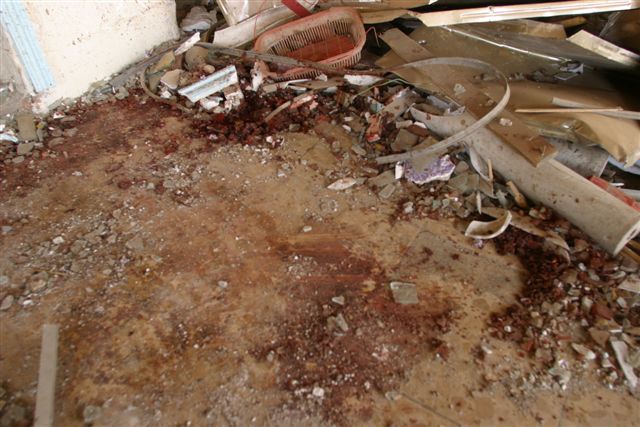 誤爆現場 レストランの床に乾ききらない血糊がべっとり着いていた。
