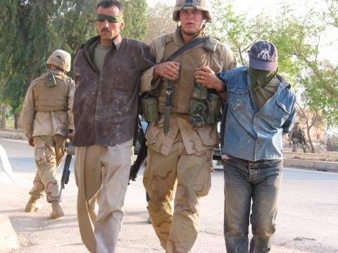 ![]() 米軍に拘束され連行されるフェダーインの残党。 (4月18日バグダッド市内) |
