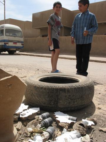 ![]() バグダッド南部ドーラの町に転がっていた クラスター爆弾の子爆弾。 不発弾、いつ爆発するかわからない。 |