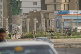 この写真は3月5日パレスチナホテル前のロータリー(サダムフセインの銅像が引き倒されたロータリー)で なぜかTVクルーを捕まえて、身体検査をしていた。 もっと近くで撮影したかったのだが、危険なので遠くからしか撮れなかった。