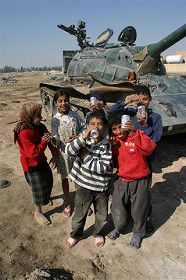 アブドゥール・ラフマン君も玄関に出てきたがすぐに引っ込んでしたまった。 具合を訪ねると「食欲が無く、顔色も悪い。 髪の毛が抜けることをとても気にしていて、神経質になっている」と叔父のアブダルさんが説明してくれた。 今飲んでいる薬はとても強い薬で副作用も強いらしい。 子ども心にも、髪の毛が無くなることで自分がどんな病気に掛かっているのかわかっているらしい。 結局私が帰るまで、姿を見せなかった。写真を撮られるのがイヤだったようだ。 アブダルさんにお願いして、戦争中アブドゥール君が住んでいたアル・ナクワ地区の家に連れていってもらうことにした。 アブドゥール君が白血病になってから、思い当たる節があって、両親はニューバグダッドの母親の実家に引っ越してきた。 それは戦争中アル・ナクワ地区にたくさんの爆弾が投下され、 その爆弾が劣化ウランや有毒物質を含んでいたのではないか?そのために、 アブドゥール君が白血病になったと思っているのである。 その真偽は定かではないが、爆撃された現場に連れていってもらうことが今回の訪問の目的だった。 バグダッドの西、バグダッド国際空港に近いその場所は近くに、 サダムの宮殿や息子クサイの軍事組織の戦闘司令部が置かれ、米軍に徹底的に破壊された地区だった。 現在は米軍が空港を占拠し占領支配の拠点になっている。 その一角にイラクでは珍しい集合住宅のアパートが建ち並んでいた。 ちょうど60,70年代にたてられた日本の集合住宅に似ている。 ここは元内務相や大統領警護隊などの職員が国から住宅を与えられ住んでいたらしい。 その一角にアブドゥール君のアパートはあった。 お母さんのアハラム(28)さんは私が持っていた放射線測定器でこのあたりを測ってくれと言うので、 測定してみたが異常値は出なかった。アハラムさんに「大丈夫、汚染はされていないよ」と言っても何か不安そうな目つきだった。 我が子の病気の原因をはっきりさせたいと思う親心が切々と伝わってくる。 ブラッドレー戦車が砂埃を巻き上げながら猛スピードで基地内から出てきた。 あの、ブラッドレー戦車も劣化ウラン弾を使っている。 近くには破壊されず残されたイラク軍戦車が放置され子供たちが登って遊んでいた。 手にはコカコーラの缶を持っていた。誰にもらったのと聞くと、米兵にもらったと言っていた。 戦争前にはコカコーラはイラクにはなかった。コーラと言えばペプシが代名詞になっていたのに。 | |