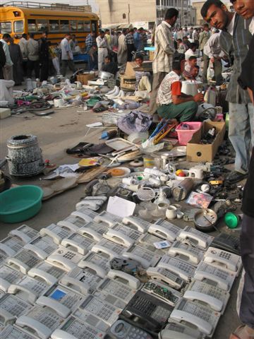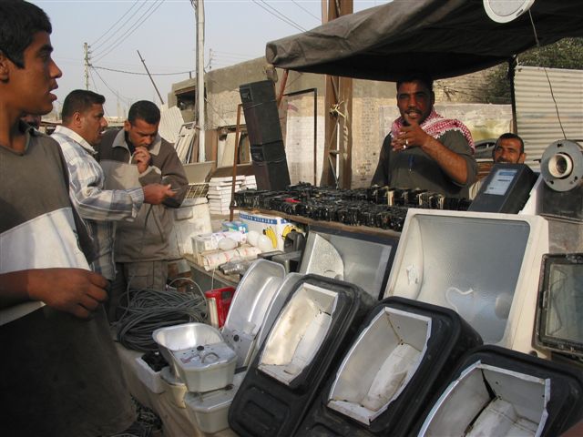 バスラの市場の外れに、アリババ市場がある。 サダム政権が崩壊してすでに一年が立つのにまだ、略奪品が売られている市場がある。  今は盗品が多いのかも知れない。売っている人は全く罪の意識は無い。  街灯のランプ、事務用机、イス、コピー機、 カーペット、機械部品など何でもある。  人垣が出来ているので、人をかき分け中を覗いてみると白昼堂々と、銃が売られていた。 カラシニコフ銃は40ドル前後、ピストルは200ドル前後だという。一般の市民は簡単に銃を買うことが出来る。 さすが、写真を撮ってはダメだという。イギリス軍のパトロールが来ると、蜘蛛の子を散らすようにどこかに隠れていまう。驚くことにバスラ警察署が市場の横にあったが、ここは警察も手を出せない無法地帯なのだ。