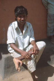 ウラン鉱山周辺にはガン、白血病、先天性異常や不妊、流産、が多発している。 鉱山労働者になった村人は安全教育も行われず、自らも肺ガンや皮膚ガンなどで倒れていった。 シャンカル・マージクさん(55歳)は3年前15年間働いた鉱山をやめた。原因は肺ガンになったからだ。 「坑内でマスクもつけず作業した。マスクや防護服は会社の えらい人だけがつけていた。我々には危険だと言う説明はなかった。 木綿の作業着は家に持ち替えて洗濯した」といって苦しそうに咳き込んだ。 バンゴ村は3番目の放射性廃棄物投棄ダムから2キロ南にある。人口1400人の小さな村だ。 ちょうどヒンズー教の祭りが行われていた。 祭りの会場に集まっていた子どもの中に足の指が完全に欠落している子どもや、口蓋裂傷の子どもがいた。 話を聞いているとたくさんの人が周りに集まって来た。 その中にもう一人、片足のない子どをみつけた。 「この子は前世に悪人だったのよ、だからいまこうして苦しんでいるのよ」と周りにいた大人たちが口々に言う。 これが生まれながらにハンディーを持った子供に向けられる言葉かと一瞬とまどってしまった。 | |||||||||