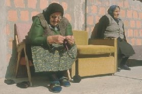 もうすぐ厳しい冬を迎える。 お年寄りたちは日向ぼっこをしながら編み物をしていた。 |