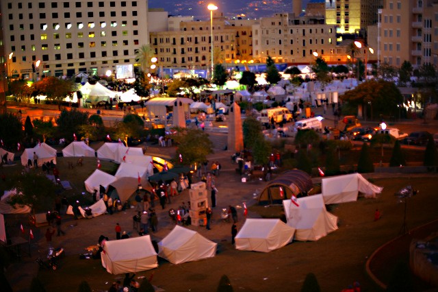 先週から始まった国会、内閣府を包囲したヒズボッラなどの野党支持者の集会は連日続けられ、全国から集まった支持者はリヤード・ソルハや殉教者広場にテントを張り泊まり込んでいる。