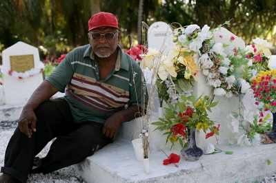 1979年にメジット島のジェリーさん(1953年生まれ)と結婚して、1980年からメジット島に住んでいる。子どもは6人生まれた。家族はみな健康のように見えたが、昨年ジェリーさんが子宮ガンでなくなってしまった。医師は核実験のせいだと言った。かけがえのない奥さんを失って「とてもショックだった。悲しくて大きな声で泣きました」「私は健康にとても不安を感じています。肝臓が痛むのですが、これも汚染されたものを食べていたからかもしれません」と言って奥さんの墓の前に座り込んでしばらく動こうとしなかった。