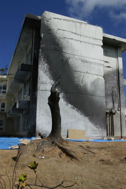米軍普天間基地を飛び立ったCH53大型ヘリが墜落した沖縄国際 大学本館の建物。事故は8月13日に起こったが、黒く焼けただれた本館建物の 壁を保存しようと学生たちが大学側に働きかけている。
