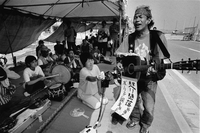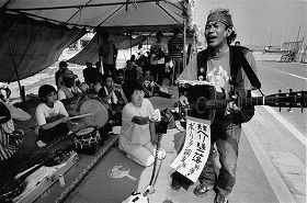 座り込みのテント前でうたうシンガーソングライターの「まよなかしんや」さん。 (2004年9月9日) |