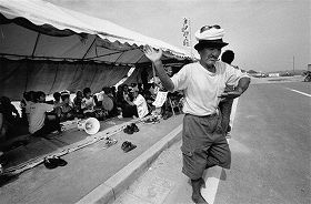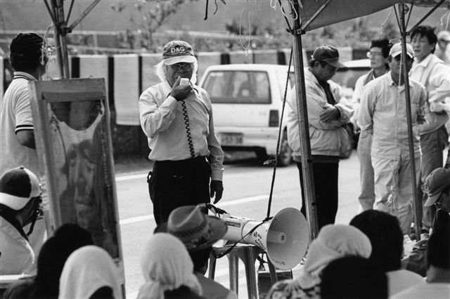 座り込みの皆さんに挨拶する地元辺野古の命を守る会の金城祐司さん。 (2004年9月7日) |