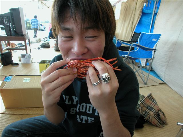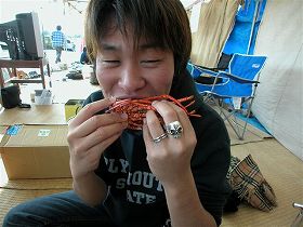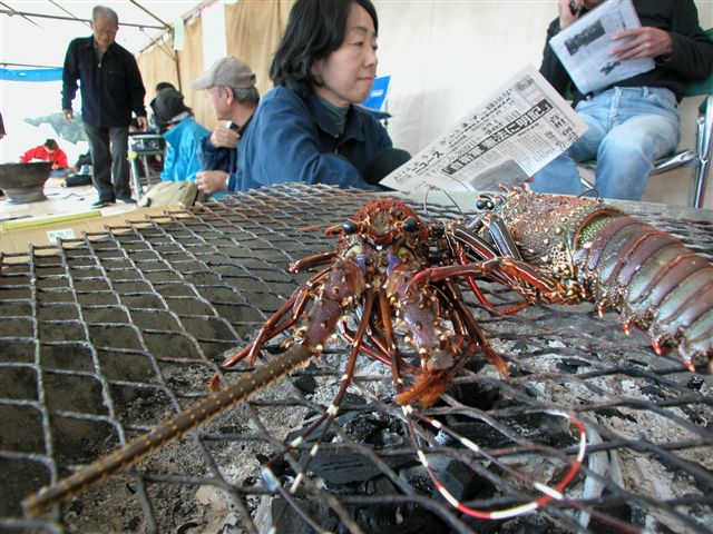 ウミンチューが捕りたての伊勢エビを座り込みテントに届けてくれた。炭を熾して生きたまま焼いた。
