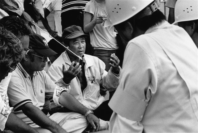 那覇防衛施設局の職員が説得に来た。逆に説得するヘリ基地反対協の具志堅とおるさん。 (2004年9月6日) |
