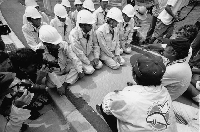 那覇防衛施設局職員が座り込み現場に説得にやってくるがいつも、逆に説得されて帰って行く。 (2004年9月7日) |