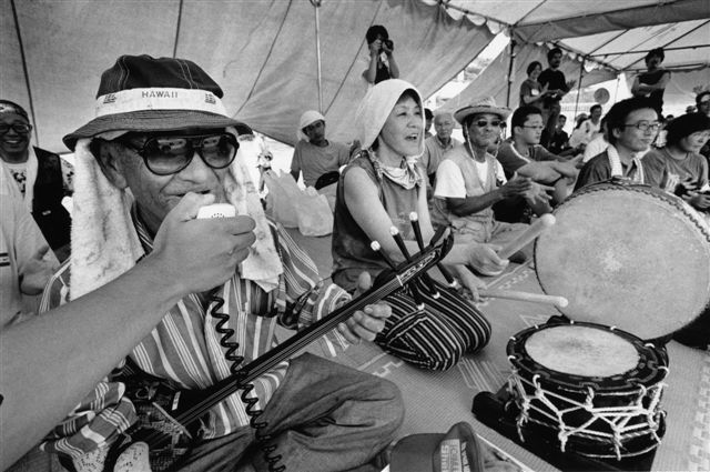 いつも座り込みには三線を持って場を和ごませてくれる金城繁師匠。 (2004年9月8日) |