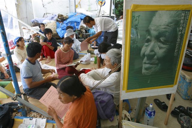 座り込みのテントには伊江島の土地取り上げに反対して闘った阿波根昌鴻さんの遺影が掲げられている。 |