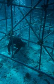 ボーリングの櫓の下に潜って櫓の点検をする施設庁に雇われた業者のダイバー。