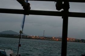 毎日夜が明ける前から海上に出てボーリング作業の阻止行動に入る。櫓から米海兵隊キャンプシュワーブ基地の灯が見える。