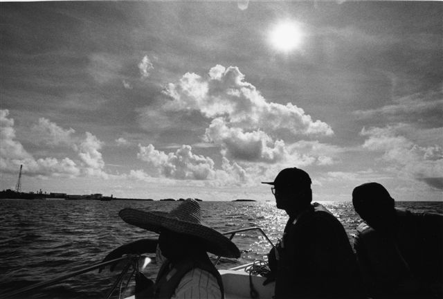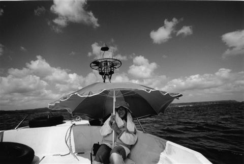 抗議船の操縦をする平良夏芽さん。 (辺野古沖 2004年9月16日) |