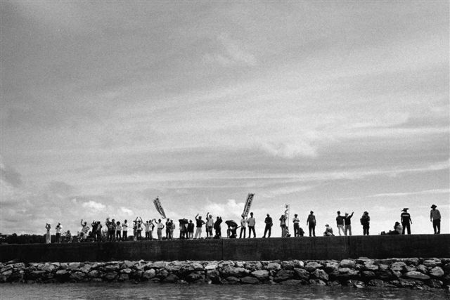 帰ってきた抗議船を迎える陸で座り込んでいた人々。(辺野古漁港 2004年9月16日) |