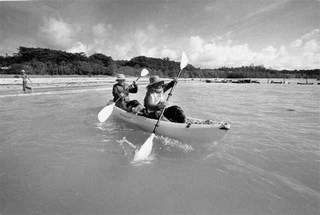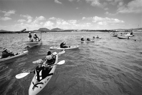 カヌー隊の出港 (辺野古の浜辺 2004年9月7日) |