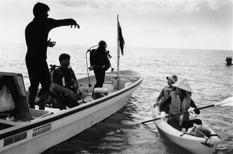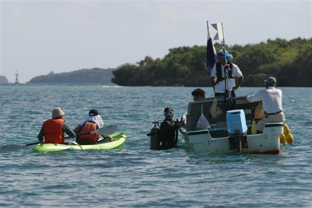 潜水調査のダイバーを説得するカヌー隊。 (2004年10月1日辺野古沖リーフ内) |