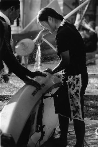 海上抗議が終わってカヌーを水道で洗うのが日課だ |