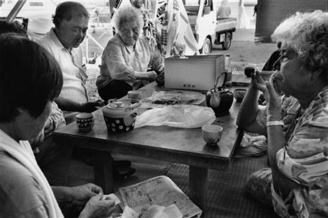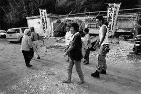 座り込みを終えて帰宅するオバアたち。見送る事務局の晋くん。