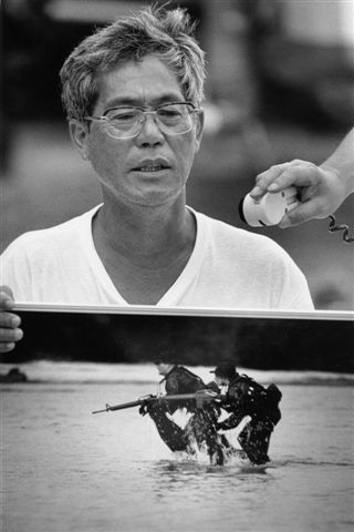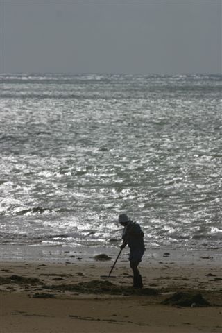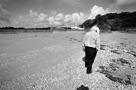 カヌー隊を見送った後、一人浜辺を歩く祐治さん。 (辺野古の海岸 2004年9月17日) |