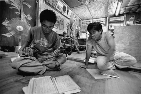 台風襲来で海が荒れ防衛施設庁も調査が出来ず休日に。事務局の冨田晋さんは三線の練習を始めた。