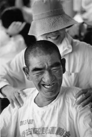 肩もみをして貰って大喜びの島袋トシヒサさん。