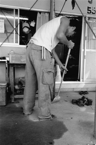 ひとり、辺野古の浜を掃除する与那覇さん (2004年9月27日辺野古の浜) |