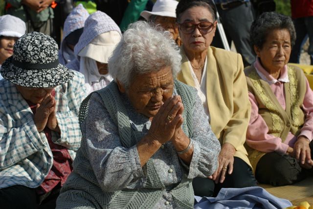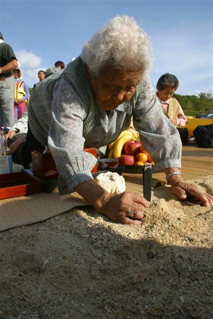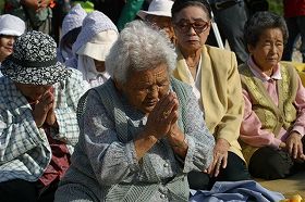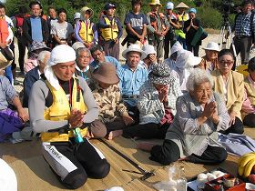 座り込みを続けるオバアたちが海上抗議行動の前にウグワン(拝み=安全祈願)をした。