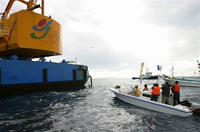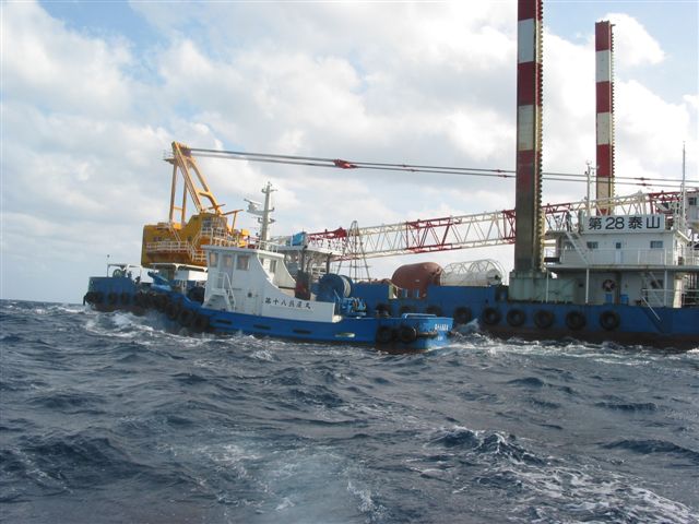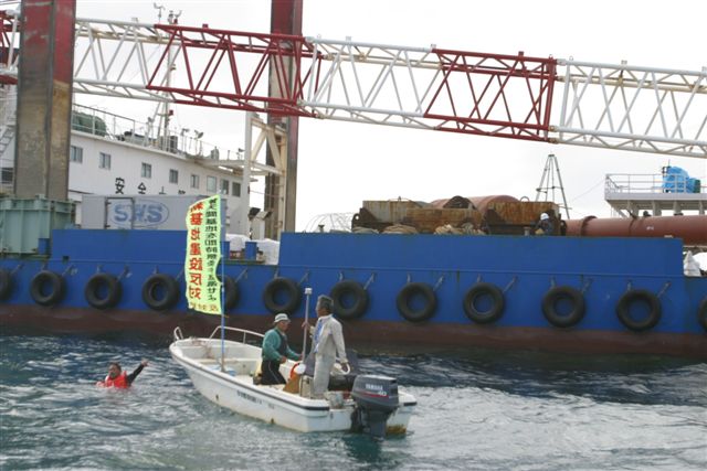 作業船の前の海に飛び込み、停船させた。