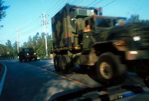ジュゴンを見に行った帰り道で出会った 演習に出かける海兵隊のトラック
