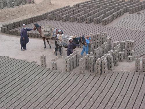 乾いた煉瓦を馬の背に乗せ、近くの窯に運ぶ。