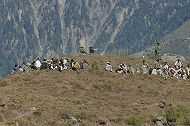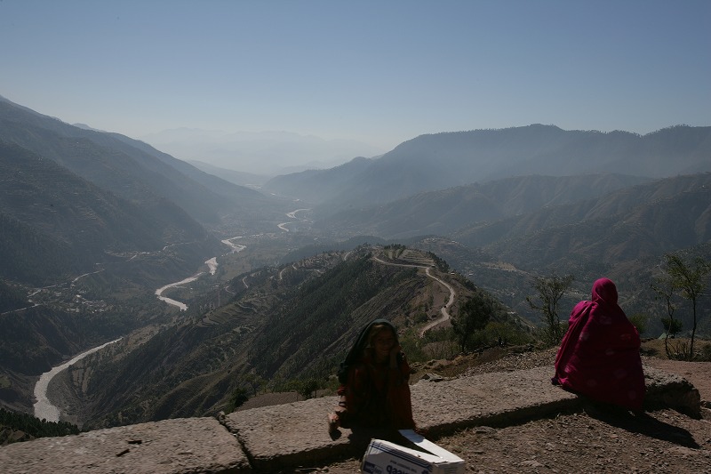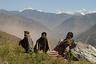 もうすぐ雪の季節を迎える。しばらく山を離れる人々がヒマラヤの端の山々が見える、丘で休んでいた(2005年10月19日)