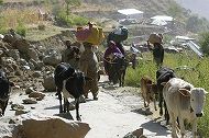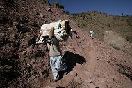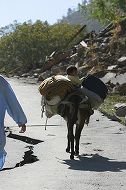 バラコットに向かう家族。ロバの背中に赤ちゃんが乗せられていた(2005年10月22日) |