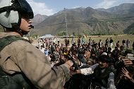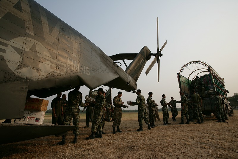 イスラムバードの空軍基地から救援物資を積み込む米海軍ブラックホークヘリ(10月25日) |