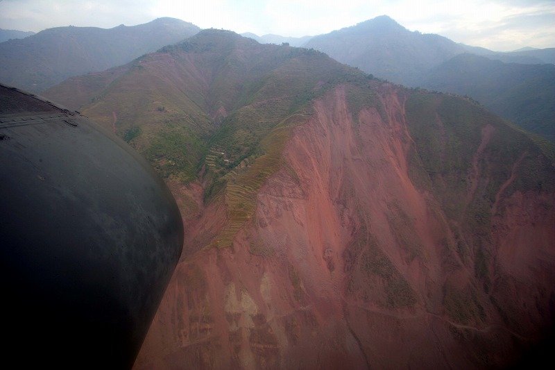 帰りのヘリが来るまで撮影を続けたが、米軍ヘリは案の定迎えにこなかった。代わりに来たヘリは国際赤十字のスタッフが何のために来たのかよくわからないが、彼らを迎えに来たヘリに便乗させてもらうことにした。なんと滅多に見られない、トルクメニスタン赤十字のヘリだった。ヘリの窓からは夕日に染まる山々が見えた。無惨にも鋭い刃物で削ぎ落とされたように、山肌が削られていた。点在する家々はつぶれ、粗末なテントが張られ、夕餉の支度の煙がゆったりと立ち上っていた。