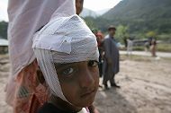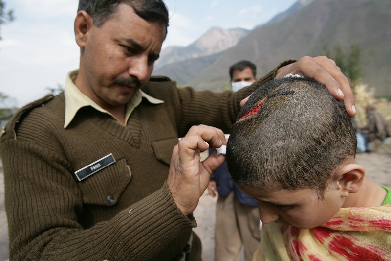 頭にケガをした少女を手当するパキスタン軍軍医(10月25日) |