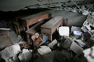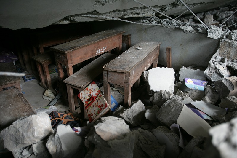 チャコリの小学校校舎の崩れた教室の隙間から机や教科書が見えた(10月25日) |