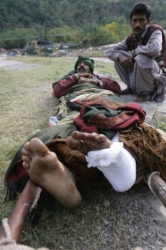 ムザファラバードからラワルピンディーの病院にスイス赤十字のヘリで運ばれる負傷者(10月26日)
