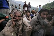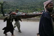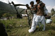 ムザファラバードからラワルピンディーの病院にスイス赤十字のヘリで運ばれる負傷者(10月26日) |